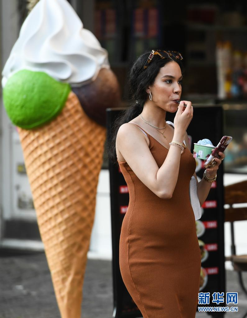 6月17日,在德國(guó)法蘭克福,一名女子手拿冰激凌從街頭走過。