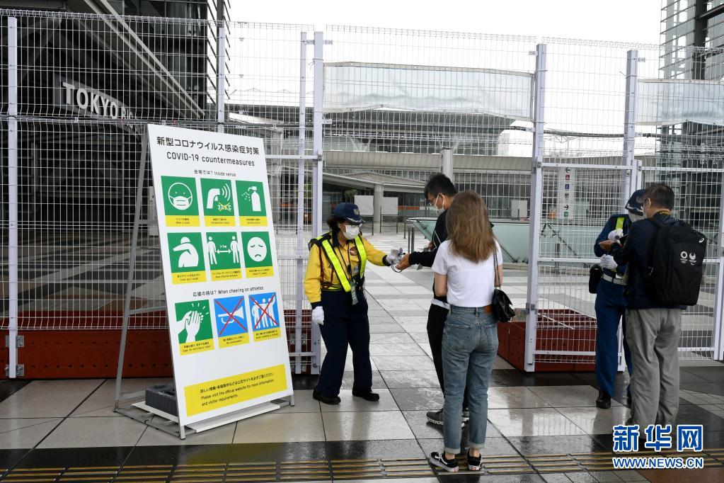 7月1日,工作人員在奧運(yùn)會(huì)主新聞中心入口檢查證件和測量體溫。新華社記者 華義 攝